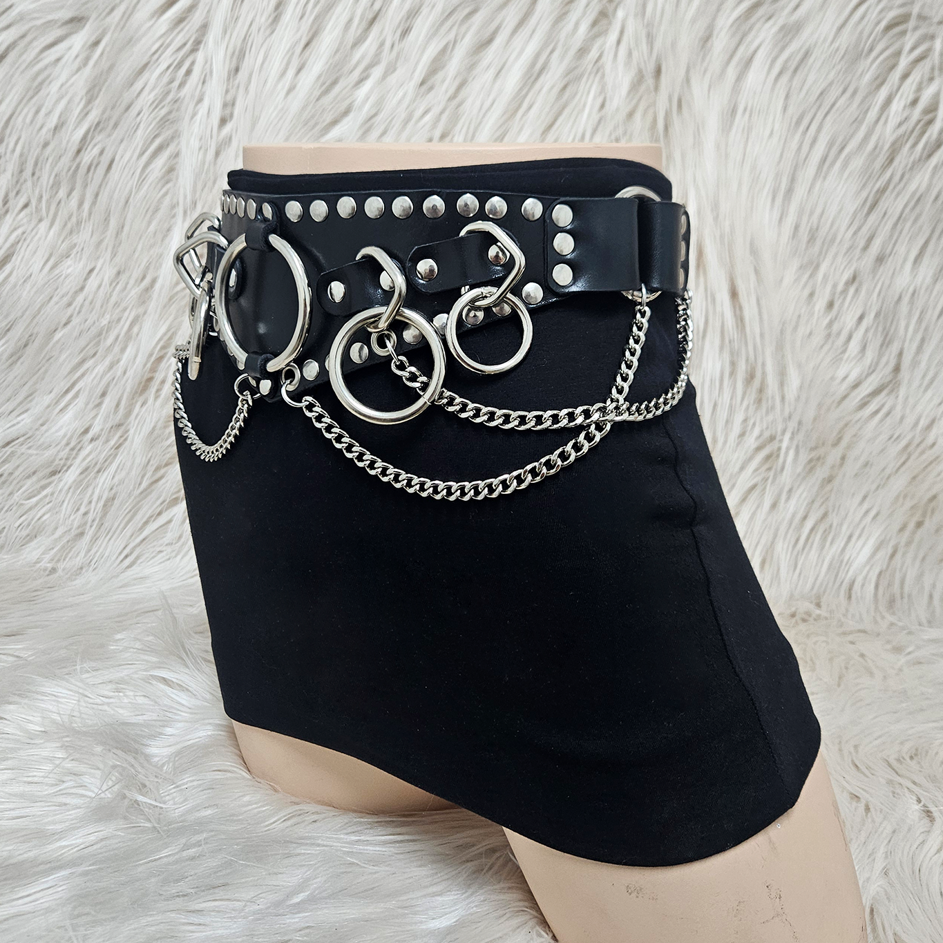 Where symmetry unravels and beauty lives in fragments, the Exquisite Corpse Belt is built for the ones who move through shadows with intention. A darker sibling to the western-styled Touch of Evil, this piece takes the same striking V-shaped silhouette and plunges it into gothic territory. Inspired by the Bauhaus song of the same name, the design drapes the body in industrial decadence. A bold center O-ring anchors a cascade of bondage - inspired hardware, wrapped in layers of chain and rivets. Structured yet chaotic, refined yet brutal. This is not an accessory, it's an invocation. Meant to be worn by anybody that dares.