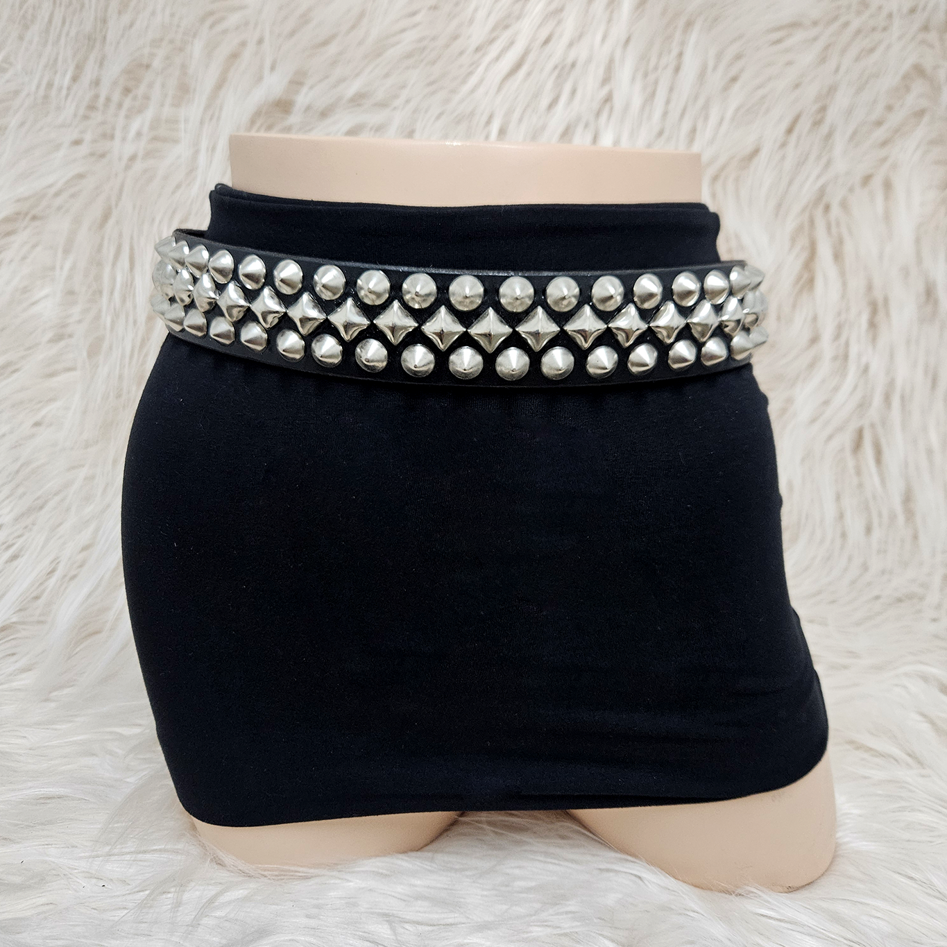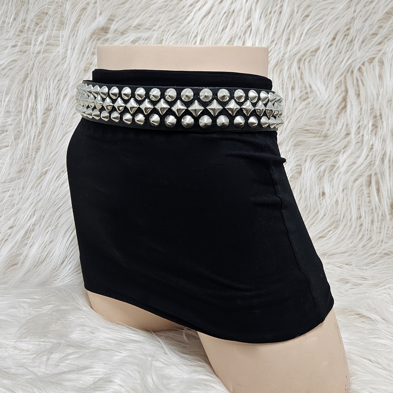 The Neon City Belt was made for high-speed nights and back alley stages. Its studwork is anything but standard — a jagged rhythm of diagonal pyramids down the center, framed by two clean rows of cone studs.